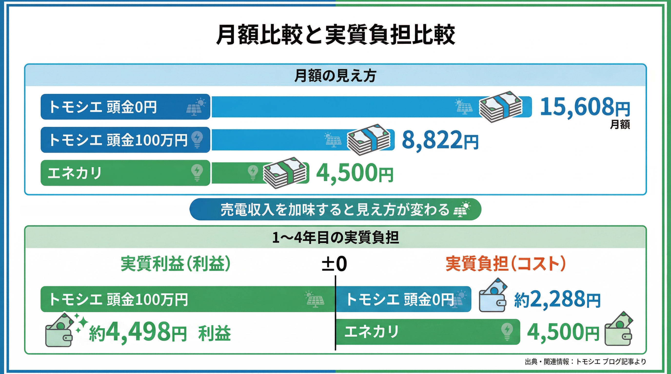 一方、売電収入や電気代削減を含めたトータルの経済性を重視するなら、トモシエのほうが検討しやすい内容です。とくに長期目線で比較すると、月額の差以上に総負担の差が効いてきます。